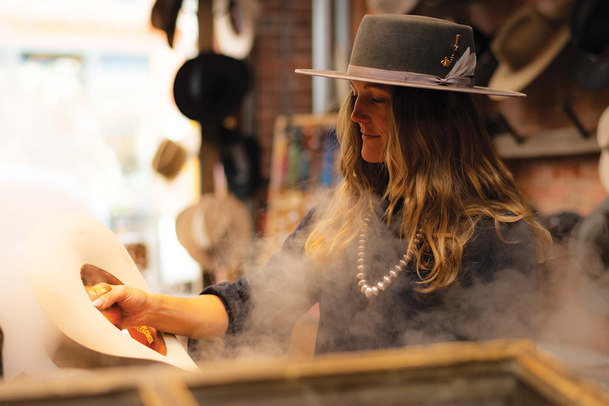 Appearing in runway shows by Gucci, Thom Browne, and Chanel, to name a few, it’s clear that cowboy hats have come into vogue in recent years. Even in Aspen, where Western wear has long been a way of life, the utilitarian accessory has surpassed its function of protecting the wearer from the elements and taken on new life as a statement piece. Now a must-have both on the trail and about town, no trip to Aspen is complete without adding a custom piece to your collection. Ahead, meet three local hatters who are mad about the craft of millinery.
