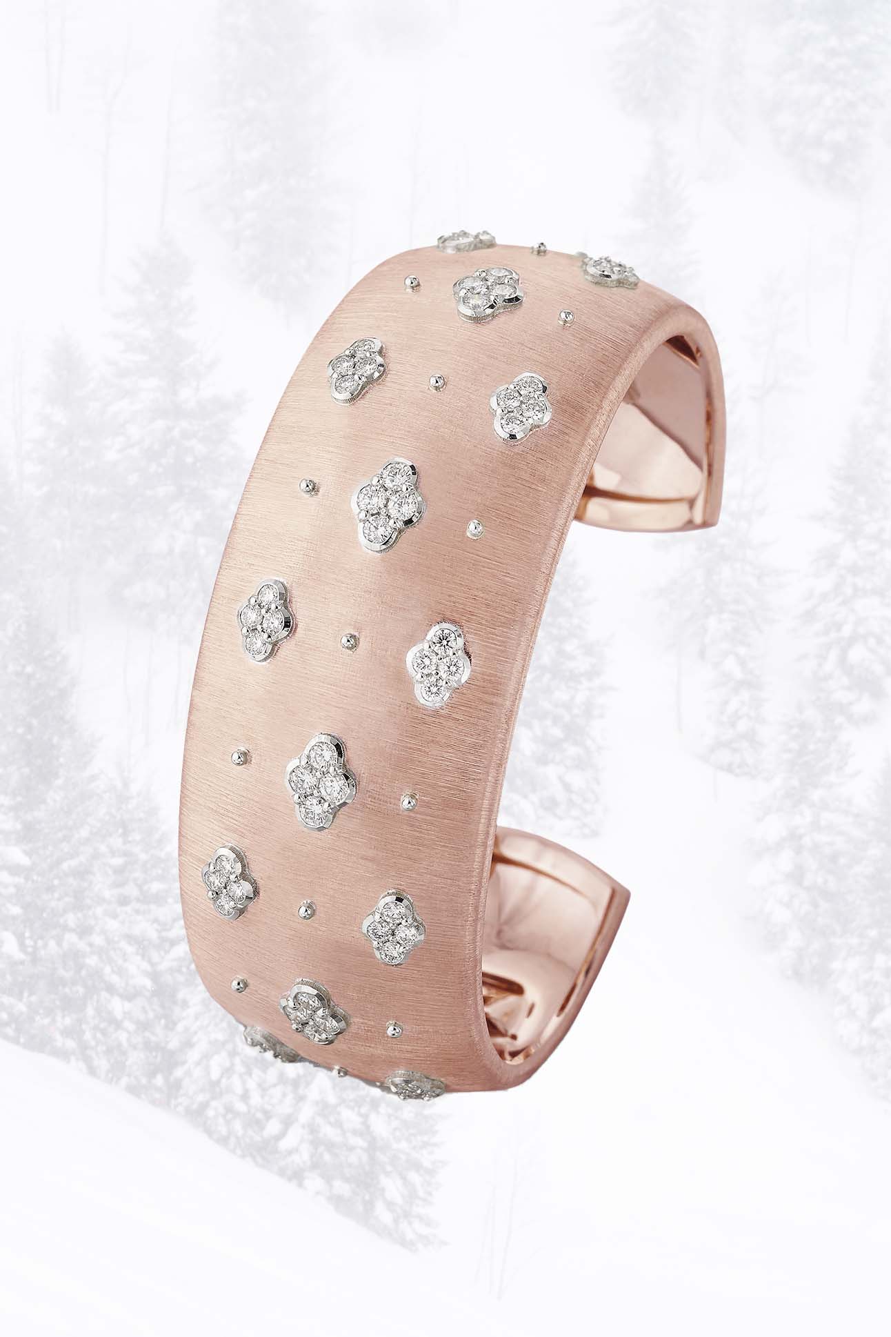 Reopening in mid-December, the beloved French maison Van Cleef & Arpels’s two-story Aspen salon is nothing short of spectacular, with an elegant bar, crackling fireplace, and custom Fromental silk wallcoverings celebrating the region’s wildflowers. Naturally, jewelry steals the show, especially collections like Snowflake, with its glistening diamonds, and Palmyre, featuring cascading diamond and gemstone pieces.