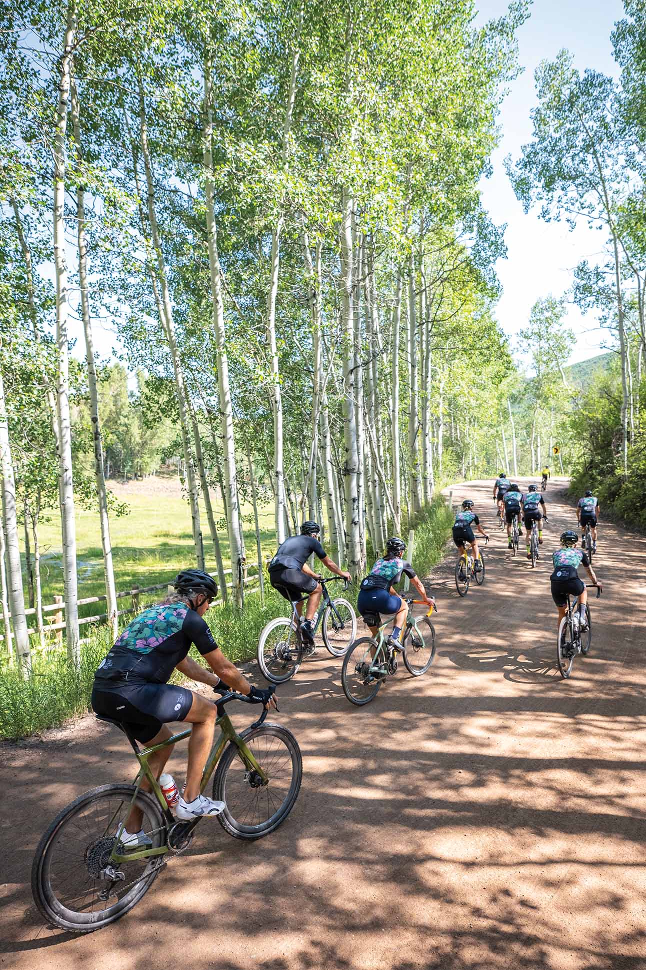 A canopy of emerald aspen leaves shimmers in the sun like sequins above our peloton of cyclists. It’s a warm summer day in Colorado’s Roaring Fork Valley and our Lycra-clad group of riders has left the buzz of downtown Aspen behind, furiously pedaling along a dusty country road hugging bucolic ranchlands.