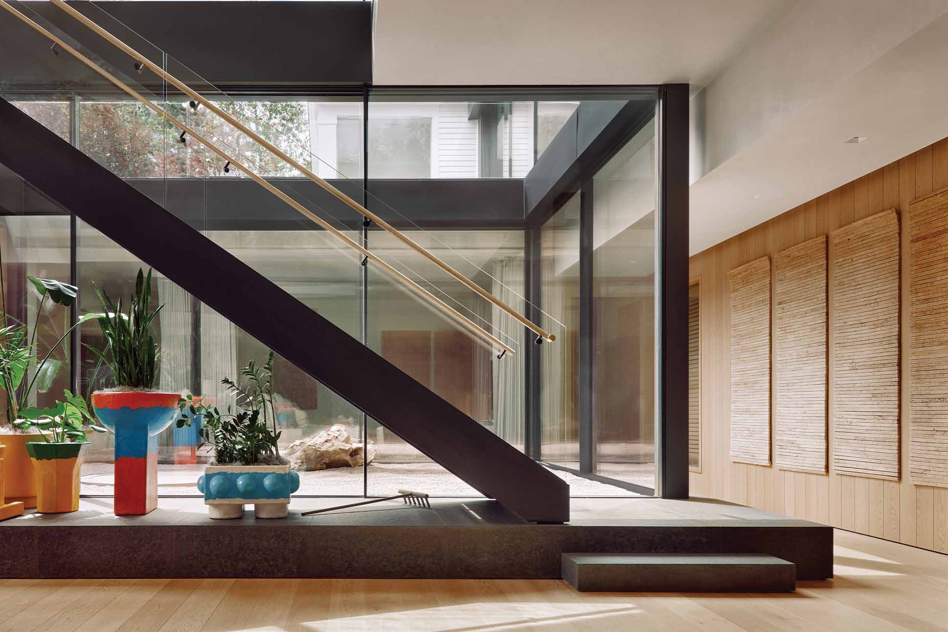 A careful restoration ensued. The original low-pitched roof and slender columns were meticulously repaired according to the town’s Historic Preservation Commission guidelines. “We had to stay absolutely true to the original exterior,” Grosfeld says. It took five years, and around $20 million, to rehab the building and connect it via a breezeway to a sleek, modern home wrapped in glass and dark wood. Only a limited amount of square footage could be added above ground to the eight-acre lot, so the couple channeled Aspen’s historic mining shafts and dug down 45 feet to create the new extension.