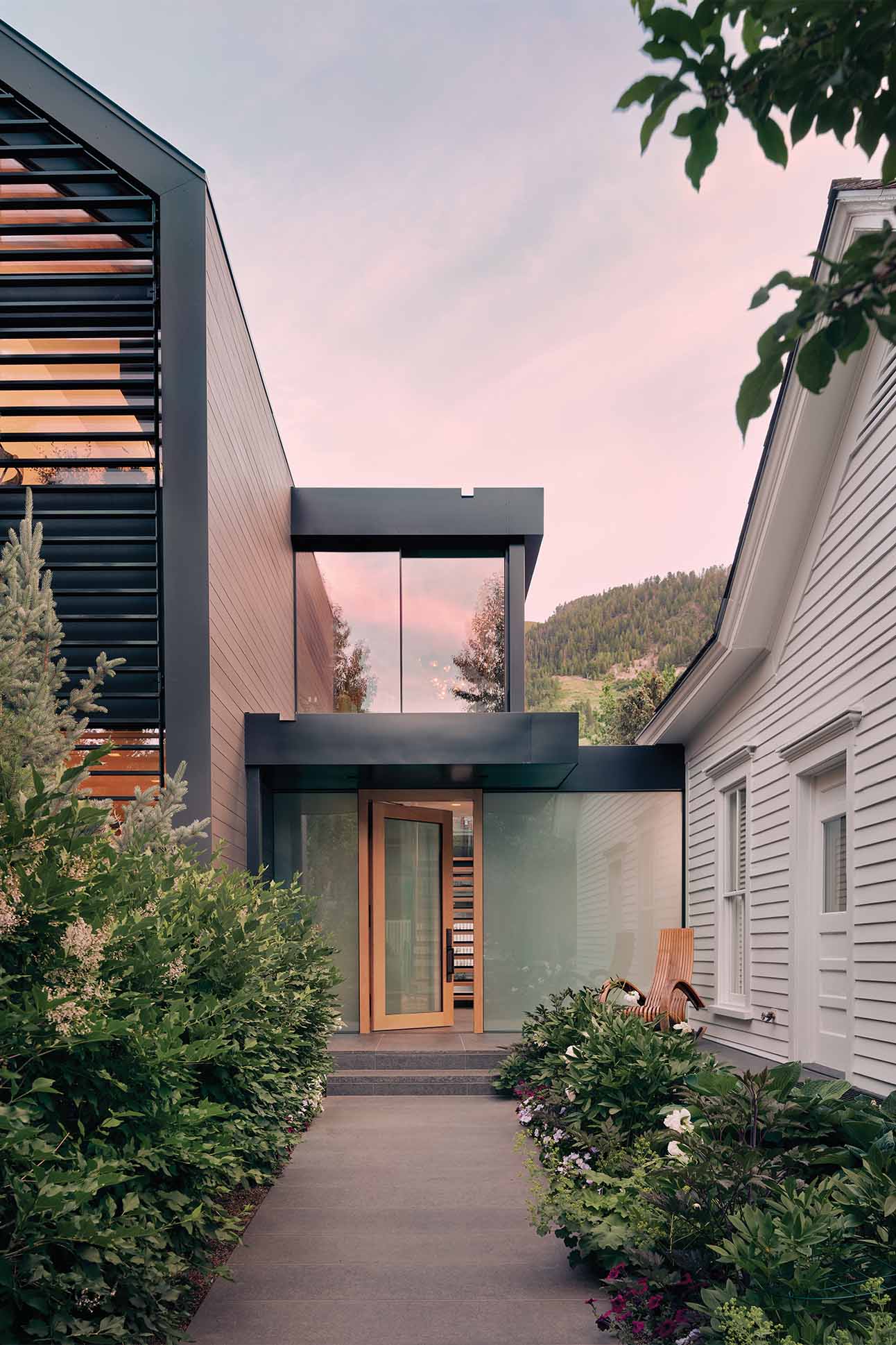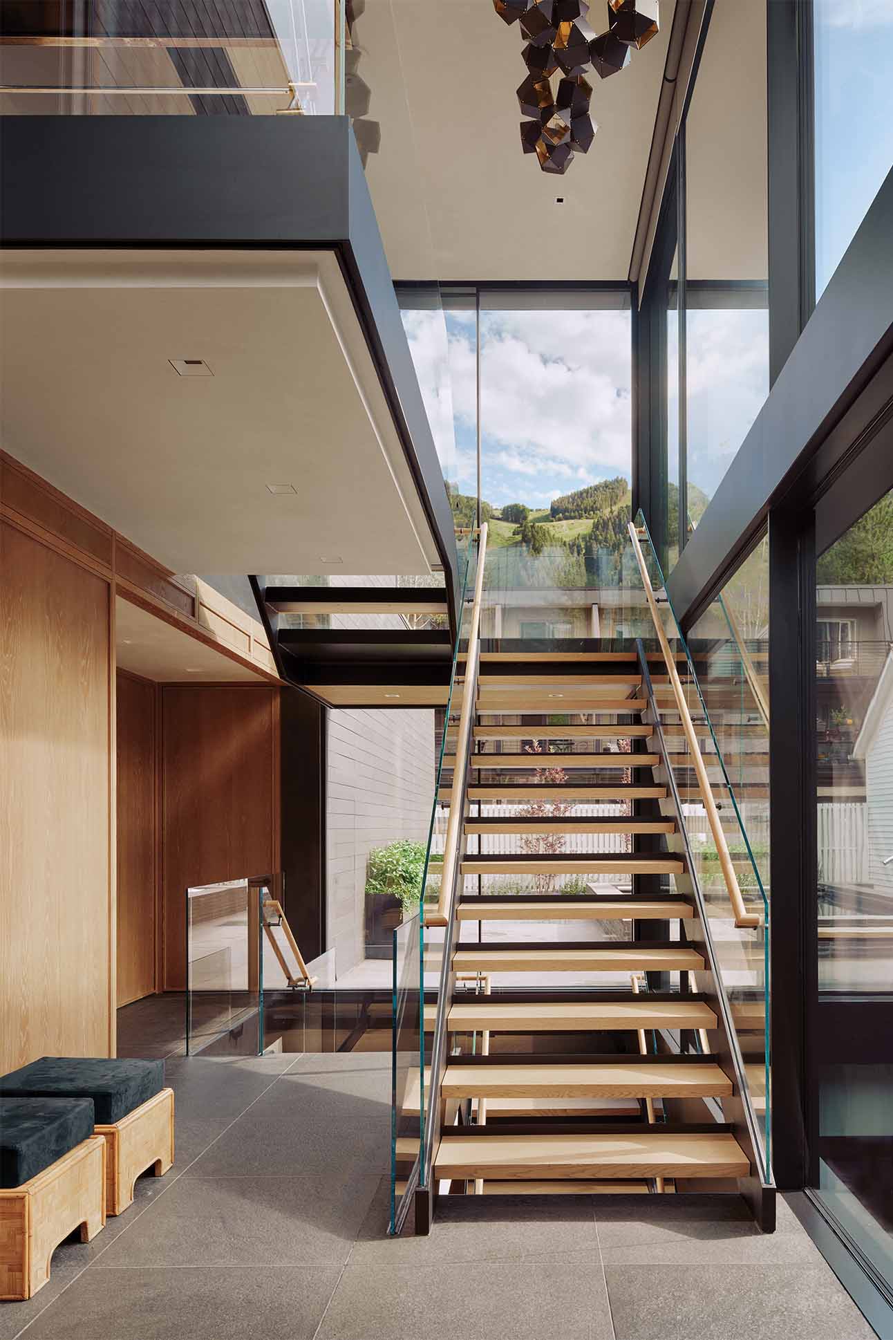Thus, every space is modern—even inside the original cabin, which has been reconfigured as an office and guest room. Skylights draw natural light into the double basement, which houses a lap pool, basketball court, and gym, along with four bedrooms and a living room with a fireplace and billiard table. Linked to the historic structure, a ground-floor addition features a primary bedroom and mudroom, while the top floor’s kitchen and great room look out over Aspen Mountain through floor-to-ceiling windows.