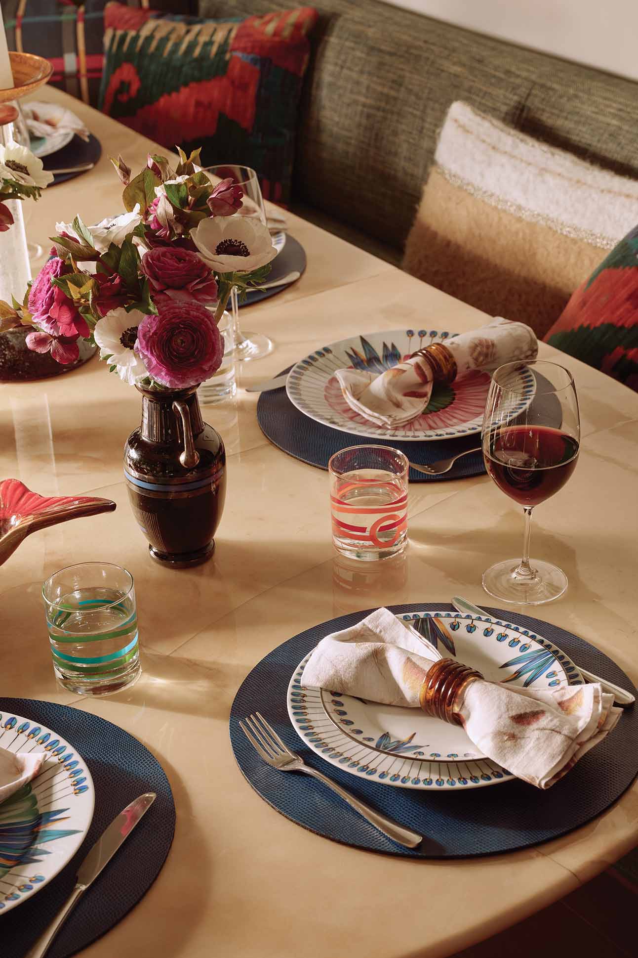 Grosfeld owns around 40 sets of china and loves creating tablescapes for dinner parties. “Similar to interiors or jewelry, I never have a formula,” she says. “I start with one piece, like a vintage tortoiseshell napkin ring or Limoges porcelain Pinto plate and build a story around it.”