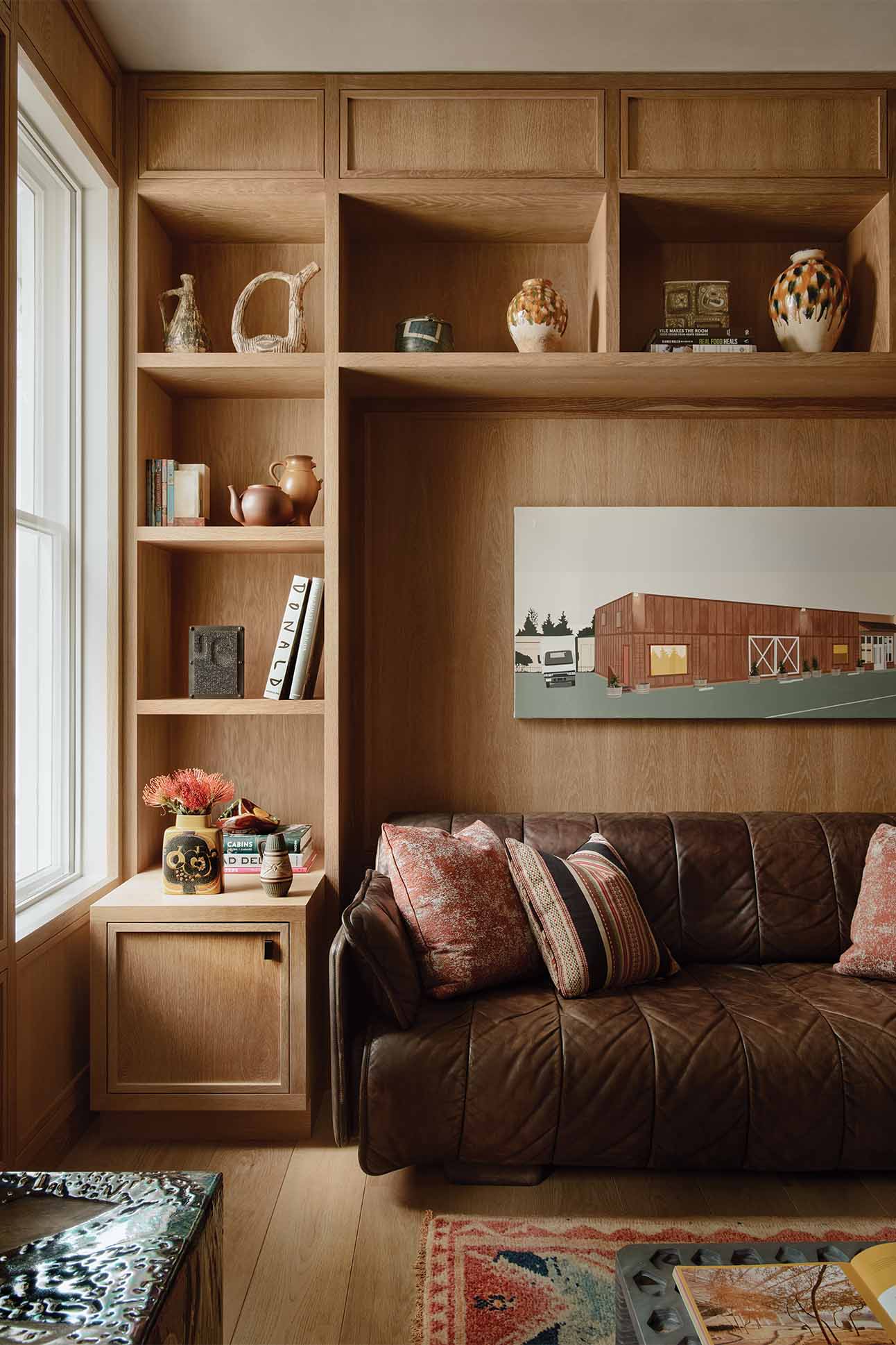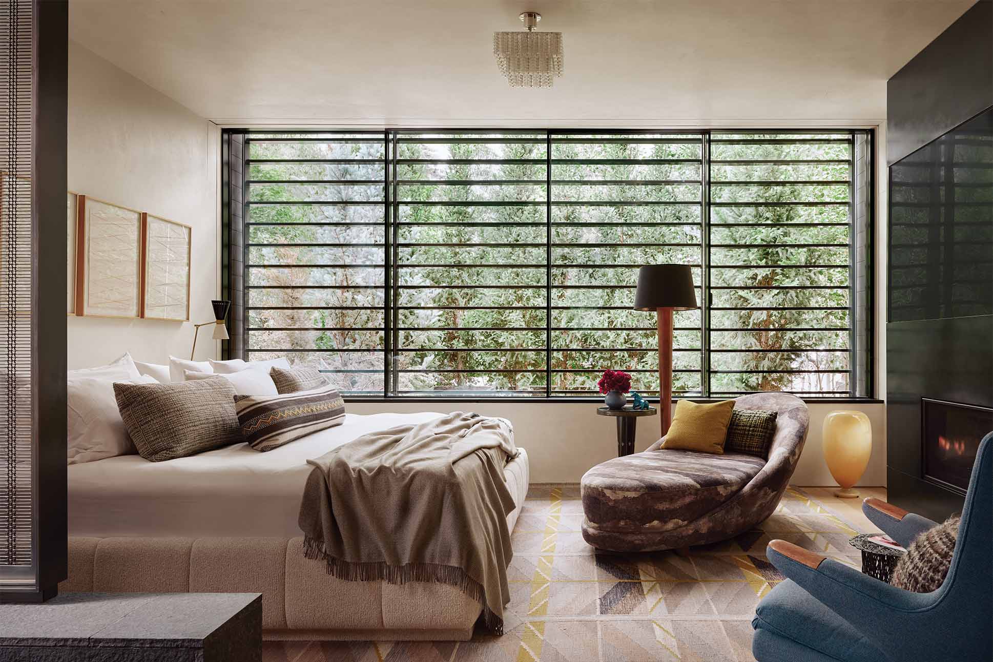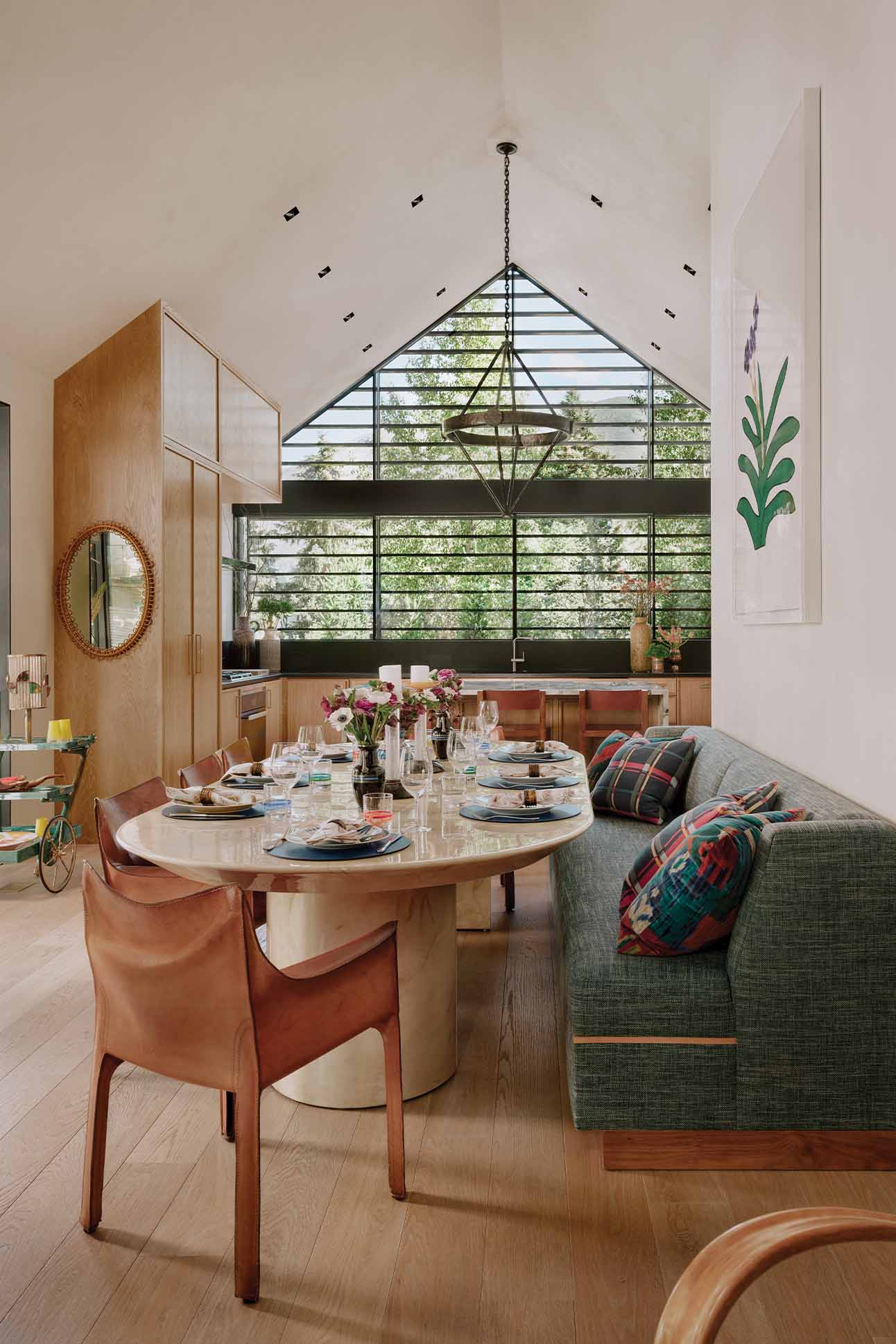 During wintertime, the great room is the couple’s après-ski ritual: He chases powder in Highland Bowl; she prefers to ski uphill for exercise at Aspen Highlands; and at the end of the day, both convene over cocktails in glassware from Pierre Cardin and Georges Briard.