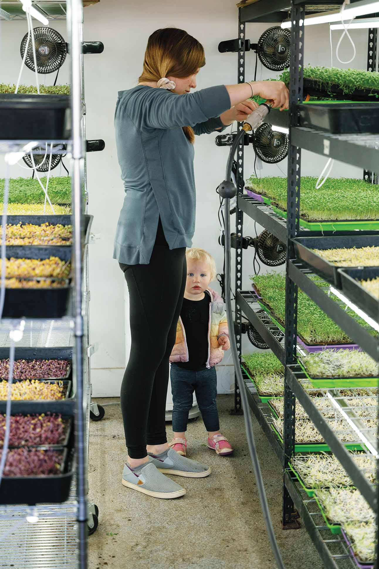 It was a fairly easy decision for farmer Kaylin Harju to begin her business, Mesa Microgreens. In 2019, Harju and her family had moved to an acreage in Silt, Colorado, about an hour from Aspen on the Western Slope. Wanting a crop that was easy grow, required little room, and could supplement the family income, Harju saw a big opportunity in small produce: microgreens. She immediately turned her attention to the 625-foot garage on the property: “I cleaned it up, epoxied the floors, installed the lights, and got started.”