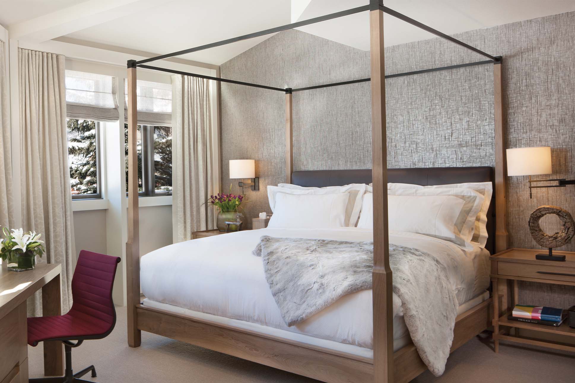 Calderon and his team looked to some of the town’s most notable people and families for inspiration—and reached out by letter to get their blessings. Included among those honored with a namesake suite: Fritz Benedict, a protégée of starchitect Frank Lloyd Wright who designed more than 200 modernist buildings in Aspen, including the 1956 Bank of Aspen building (now home to Wells Fargo and every bit a nod to Wright); Fred Iselin, a Swiss expat turned skiing instructor who pioneered the sport in his 40-year reign over Aspen and Snowmass ski schools; and Walter and Elizabeth Paepcke, the Chicago couple who spearheaded Aspen’s cultural revival, founding everything from the Aspen Music Festival to the International Design Conference in Aspen.